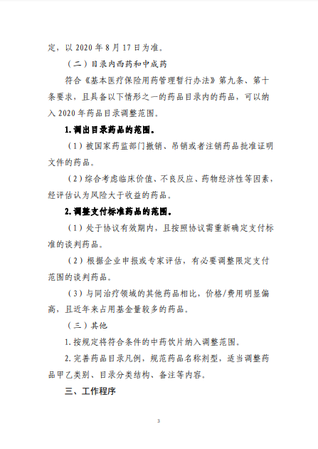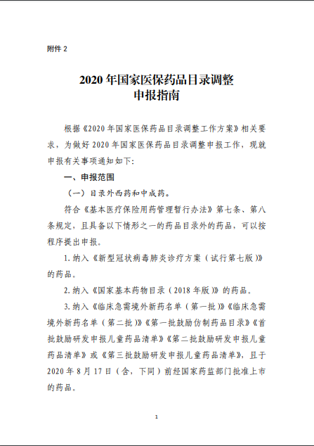 2020年8月3日-10日,國家醫(yī)療保障局就《2020年國家醫(yī)保藥品目錄調(diào)整工作方案(征求意見稿)》向社會(huì)公開征求了意見。8月17日,《2020年國家醫(yī)保藥品目錄調(diào)整工作方案》和《2020年國家醫(yī)保藥品目錄調(diào)整申報(bào)指南》正式公布。