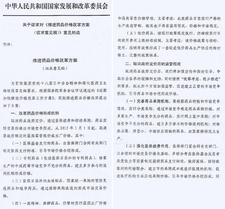 據(jù)悉2014年11月25日,國家發(fā)改委向8個行業(yè)協(xié)會下發(fā)了關(guān)于征求對《推進(jìn)藥品價格改革方案(征求意見稿)》意見的函。在此之前發(fā)改委藥品價改方案已經(jīng)多方意見征求,征求對象包括地方物價系統(tǒng)、衛(wèi)計委及人社部等相關(guān)政府部門。