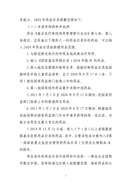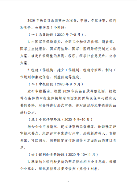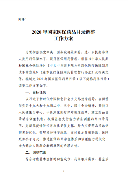 2020年8月3日-10日,國家醫(yī)療保障局就《2020年國家醫(yī)保藥品目錄調(diào)整工作方案(征求意見稿)》向社會(huì)公開征求了意見。8月17日,《2020年國家醫(yī)保藥品目錄調(diào)整工作方案》和《2020年國家醫(yī)保藥品目錄調(diào)整申報(bào)指南》正式公布。